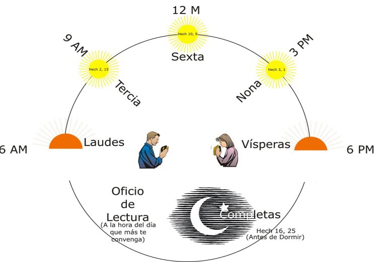 Nuestra liturgia cristiana es una continuación, como también ruptura y novedad, de la judía. No la bajamos de la luna. Los judíos ( Cristo, Pedro, San José, Pablo, Santiago, Lázaro,..) rezaron 3 veces al día: al amanecer, a la tarde y al anochecer. No se si las comunidades cristianas primitivas continuaron con eso, pero de seguro inspiró el horario. San Pablo exhortaba a alabar a Dios con salmos, himnos y cantos inspirados.